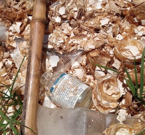En una recorrida realizada junto a los vecinos del lugar, pudieron constatar dos montones de cáscaras de huevo, y allí vieron y fotografiaron botellas y sachets, presuntamente bolsas de diluyentes estériles usadas en la industria avícola, con sus típicos piquitos azules.
